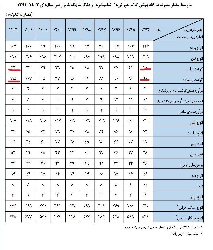 براساس این گزارش خانوار در سال 1394 به واسطه این که قدرت خرید بیشتری داشتند گوشت دام بیشتری خریداری میکردند اما در طول حدود 9 سال به دلیل آن که قیمت گوشت دام افزایش پیدا کرد قدرت خرید خانوار در خرید گوشت قرمز کاهش پیدا کرد و عملا خانوار مجبور شدند گوشت پرندگان را جایگزین گوشت قرمز کنند.