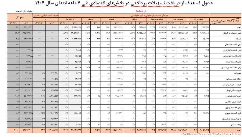 به گزارش خبرگزاری تسنیم به نقل از روابط عمومی بانک مرکزی، تسهیلات پرداختی بانک‌ها طی 7 ماهه ابتدای سال 1404 مبلغ54694.2 هزار میلیارد ریال می‌باشد که در مقایسه با دوره مشابه سال قبل مبلغ 17246.4 هزار میلیارد ریال (معادل 46.1 درصد) افزایش داشته است. از کل تسهیلات پرداختی، مبلغ 41638.3 هزار میلیارد ریال معادل 76.1 درصد به صاحبان کسب و کار (حقوقی و غیرحقوقی) و 13055.9 هزار میلیارد ریال معادل 23.9 درصد به مصرف¬کنندگان نهایی (خانوار) تعلق گرفته است.