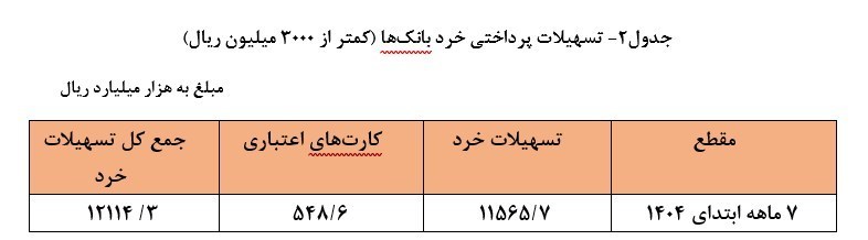 از کل تسهیلات پرداختی در دوره یاد شده، مبلغ 11565.7 هزار میلیارد ریال معادل 21.1 درصد به صورت تسهیلات خرد اعطا شده است. همچنین مبلغ 548.6 هزار میلیارد ریال نیز در قالب کارت‌های اعتباری انجام پذیرفته است، که با احتساب این مبلغ، کل تسهیلات پرداختی خرد (کمتر از سه میلیارد ریال) به مبلغ 12114.3 هزار میلیارد ریال معادل 21.9 درصد کل تسهیلات پرداختی را شامل می‌شود. شایان ذکر است با توجه به اینکه تسهیلات پرداختی در قالب کارت‌های اعتباری نیز در بخش خانوار پرداخت شده است، با این اوصاف سهم بخش خانوار از 23.9 درصد در جدول‏-1، به 24.6 درصد کل تسهیلات پرداختی افزایش می‌یابد.(جدول2)