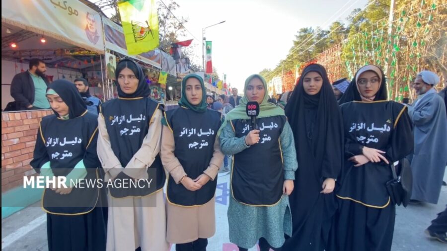 کرمان-چند دانشجو رشته زبان و ادبیات عربی دانشگاه باهنر کرمان با شعار «هم زبانی در جهان شهر مقاومت» به صورت شبانهروزی در مراسم سالگرد شهید سلیمانی به راهنمایی زائران عربی مراسم می پردازند.
