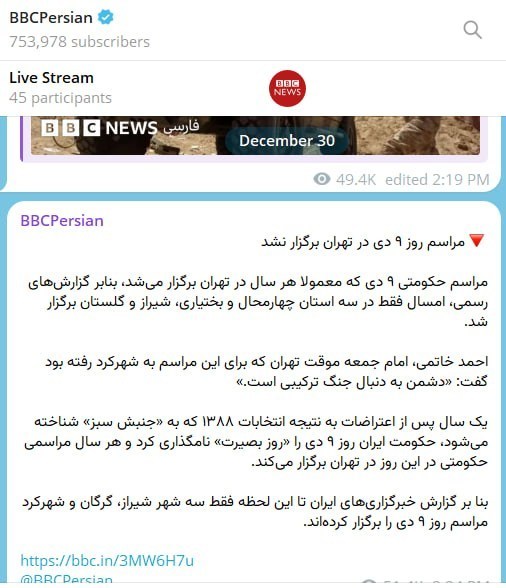 به گزارش خبرنگار سیاسی خبرگزاری تسنیم، بیبیسیِ فارسی عصر امروز در خبری نوشت که مراسم «مراسم روز 9 دی در تهران برگزار نشد»!